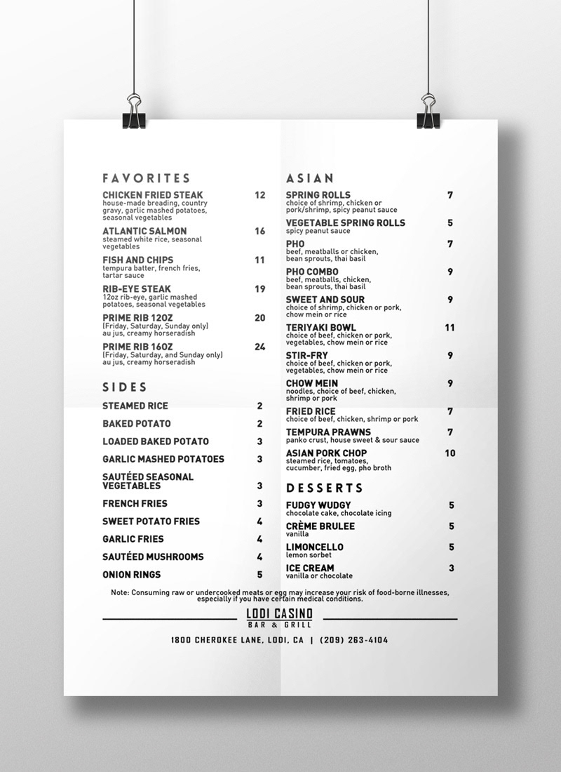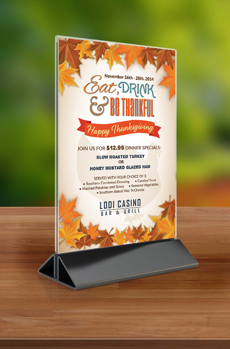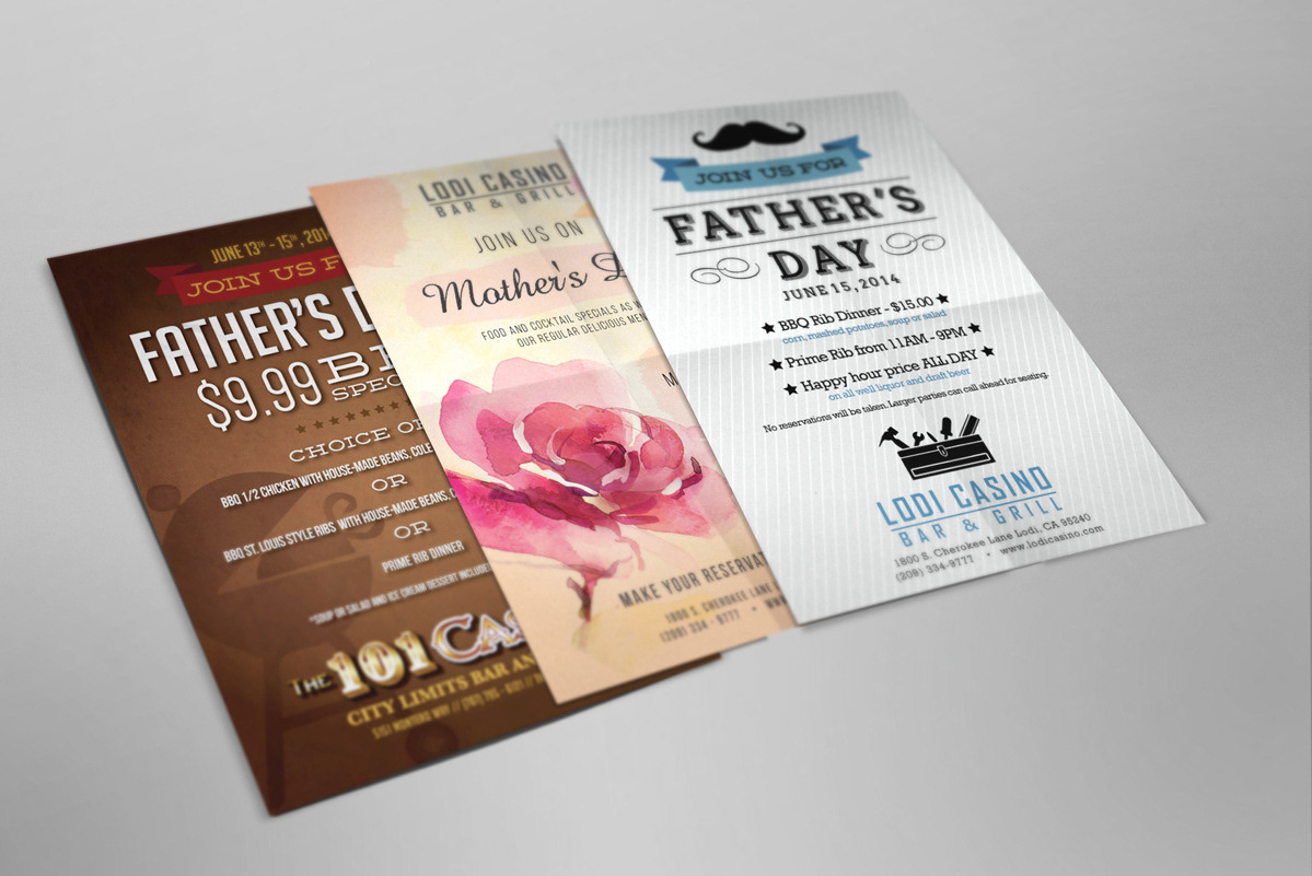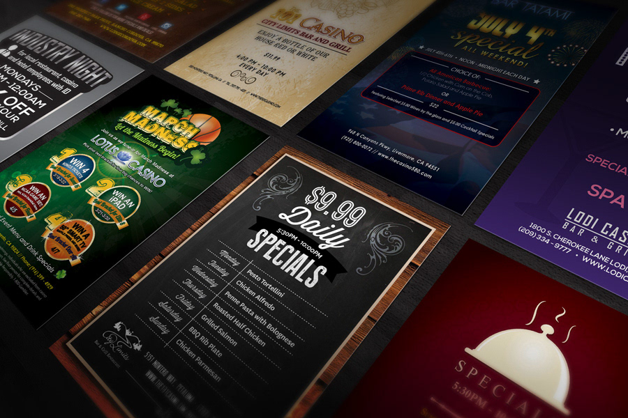 Collateral for the hospitality industry including restaurant menus, table tents, and digital graphics for social media.